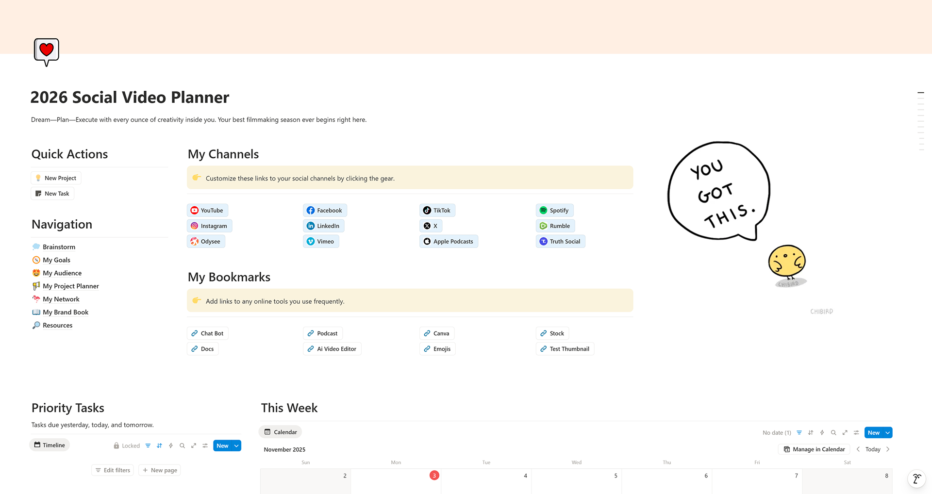 The #1 Notion template for social video creators and filmmakers. Get organized and produce your best video content ever, with pages for brainstorming new video ideas, fleshing out big goals, planning projects and tasks, mapping out your collaborative network, organizing your brand standards, and so much more.
